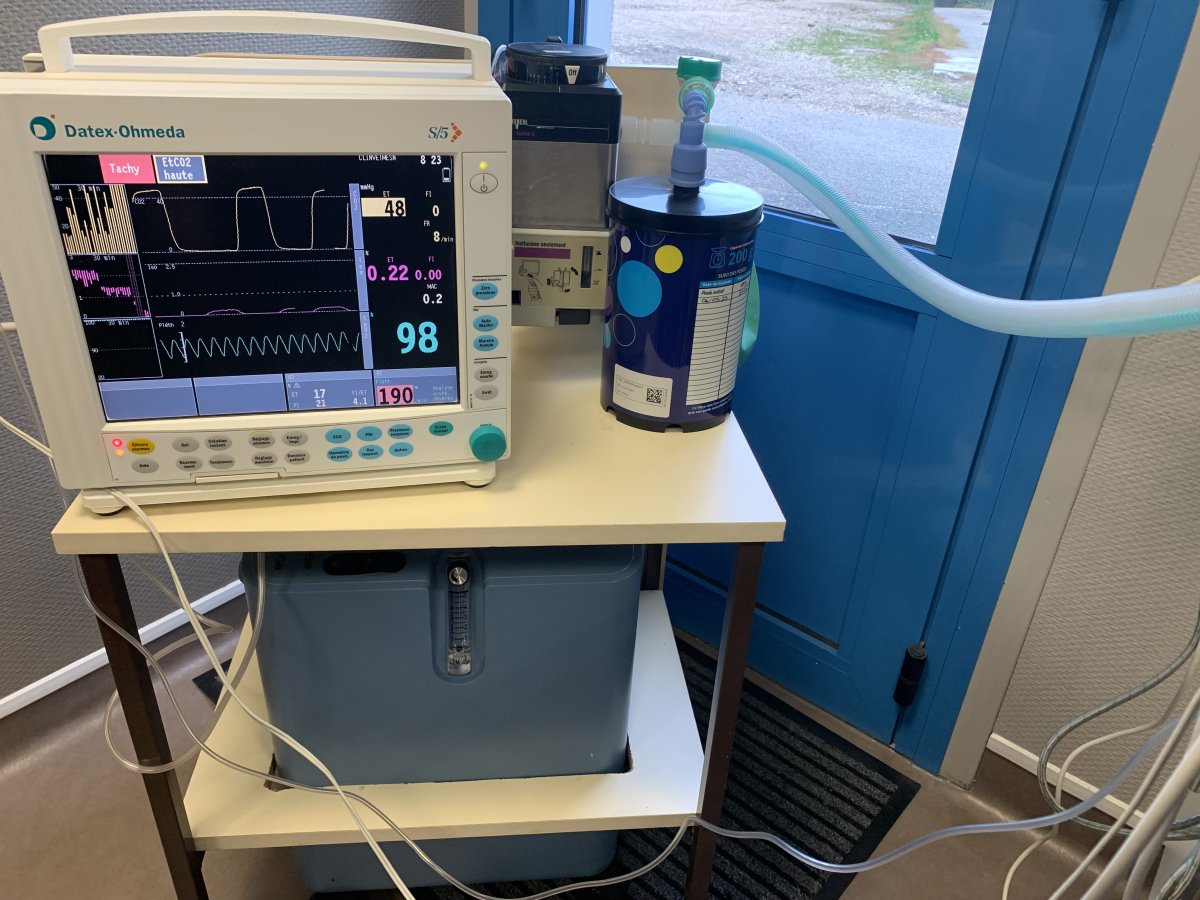 La clinique est équipée de 2 postes d'anesthésie gazeuse, complétés par un système de monitoring complet pour la sécurité de l'acte d'anesthésie comprenant l'oxymétrie, la capnographie, l'ECG.